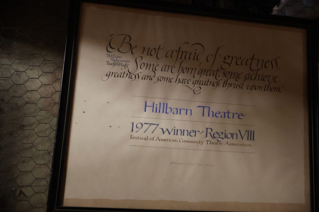 Stephen noted many of the epic plays that have been performed over the years. One he mentioned was the Tony Award-winning musical Something Rotten!. He also noted both Ragtime and The Color Purple as two of the other really big ones. Incidents at a theatre, whether backstage or, even worse, front stage, are ones that any theatre prefers to avoid. However, even Hillbarn is not immune to this; Stephen mentioned the rain (combined with the bad roof) impacting some performances in the 1990s. Also, as the electrical panel is the original, it is not easy to fix or modify. It has never failed, but sometimes outages are experienced during the rainy season, as any Foster City resident can relate to.